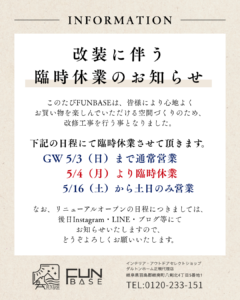 しばらくの間ご迷惑をおかけいたしますが、更に楽しめるFUNBASEをお楽しみにお待ちくださいませ。